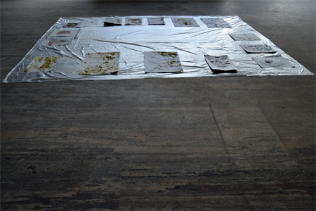 Queste carte sono il risultato di un processo di prelievo di materie instabili dai muri della colonia e di trasformazione in disegno. Il foglio è stato incollato al muro nelle zone di scrostamento e poi strappato via. Le rimanenze di croste e malte ha lasciato degli indici di forme che ho completato seguendo il concetto della Jungla arrampicante.